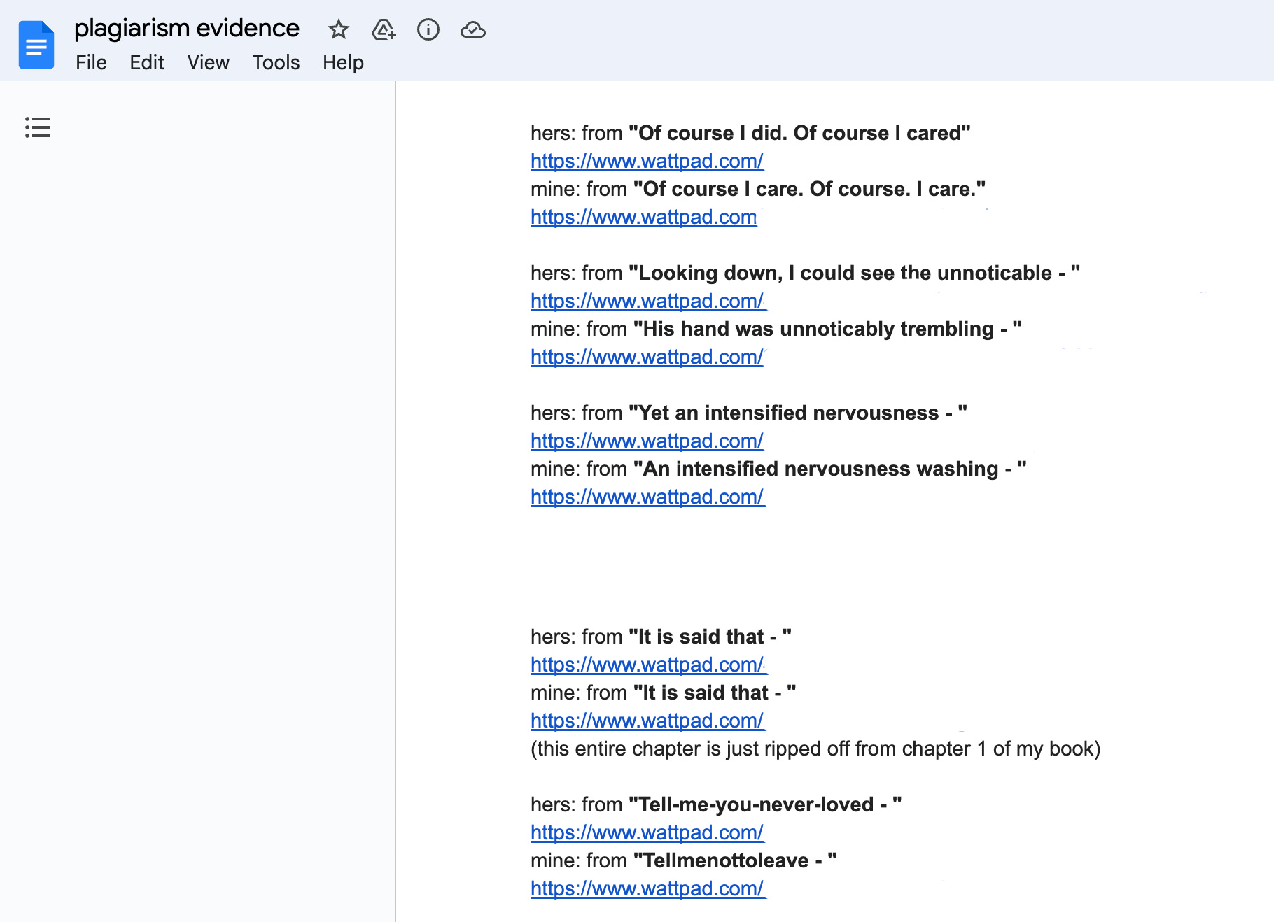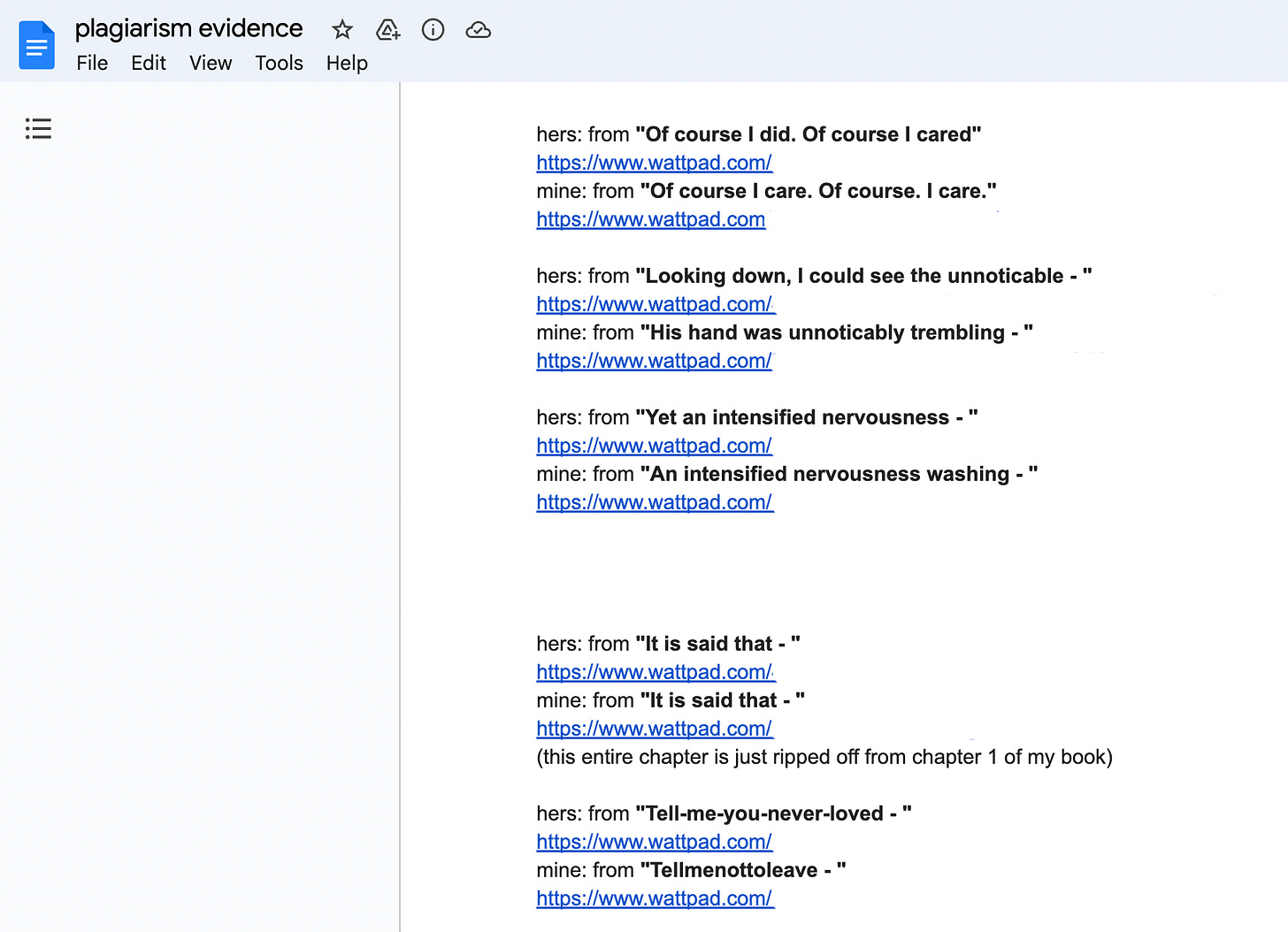 My skin would crawl, feeling incredibly violated, and then I would sit at my desk and start going through the accused person’s writing in a split-screen view against mine. For hours and hours, line by line, until I found every single thing that was copied from me. I then compiled all of this into a Google Doc because Wattpad refused to take books down unless I had “concrete evidence”. The picture below is just one of the ones I had to do, where someone pulled exact lines from different books of mine to create a twisted Tetris or tapestry of plagiarized work. This document goes on for six entire pages, and took me five hours to make.