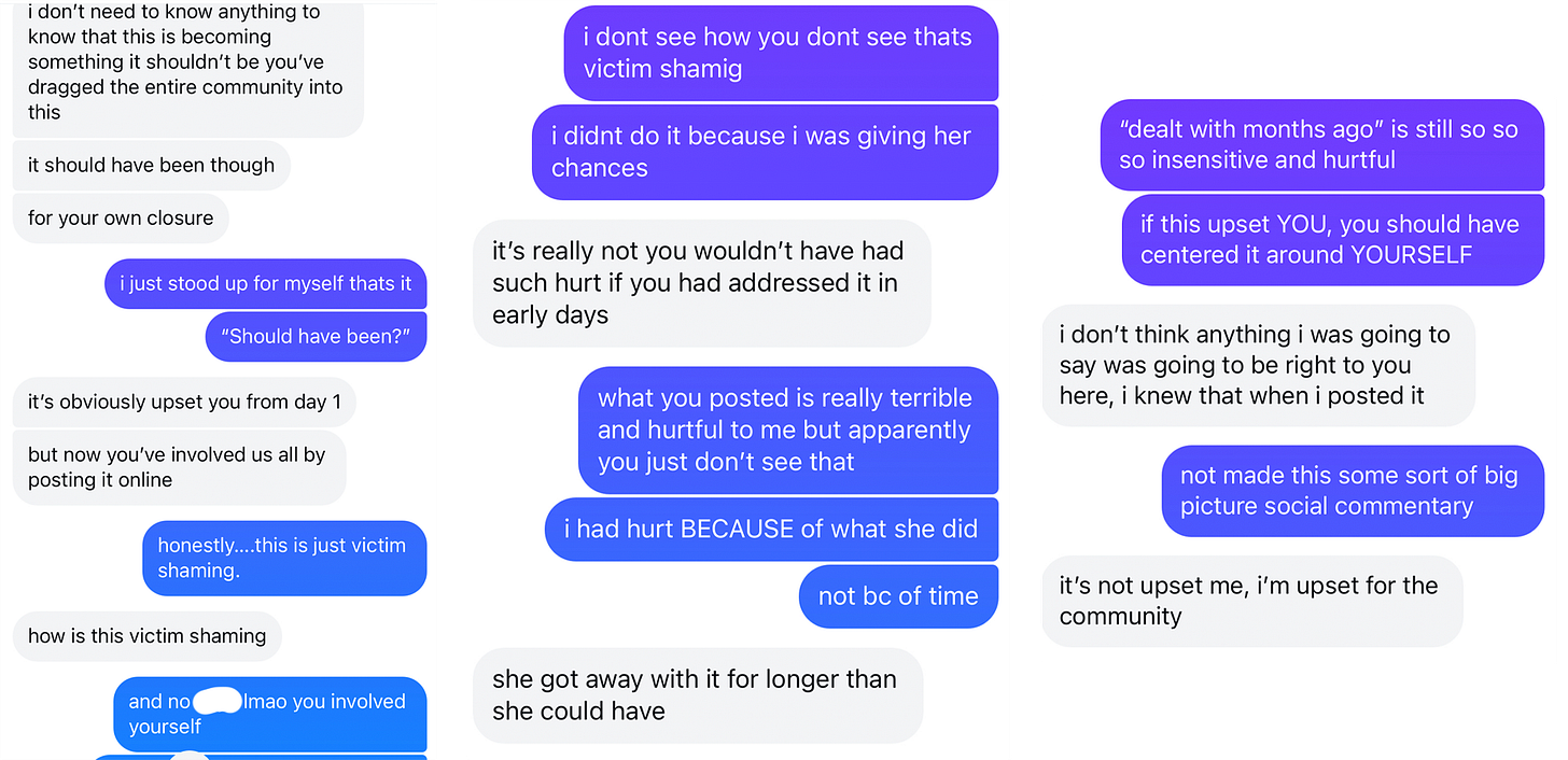 The message that made me afraid to ever think about standing up for myself actually came from another large account who I had previously spoken to numerous times on friendly terms. She, as a complete third party, posted on her story that “this should have privately been dealt with months ago”. These are some screenshots of my messages with the third-party account: