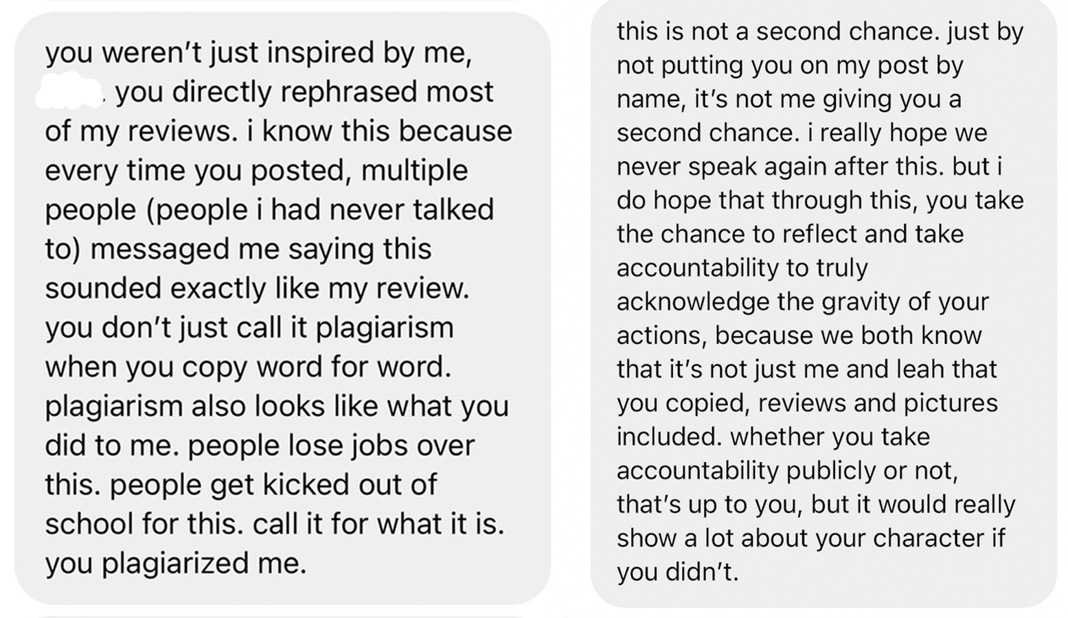 This was when things began spinning out of control. I asked her to take down every review she copied of mine, and she did. I posted the caption that I pasted above in part 1 about plagiarism and stealing content. People began catching onto who I was talking about, and she posted her own post about how her actions were the product of “numbers and pressure mixing” (ironically, she had been buying thousands of bot accounts to increase her following count). I couldn’t even see the post because she had blocked me, so my friends had to send me screenshots of it.