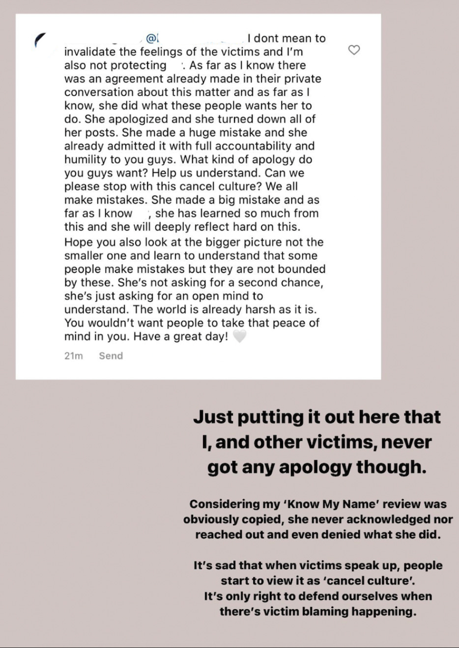 I think comparing a request for accountability for instances like these to “cancel culture” is genuinely absurd and akin to comparing apples and oranges. Below is the Instagram story of another person, who was also plagiarized by this girl but never received an apology. The comment defending the girl attempted to brush off what happened as a ‘huge mistake’ and ‘cancel culture’, although this girl had monetized off of the plagiarized content. And blocked half of the people she plagiarized so they couldn’t even see her ‘apology’.