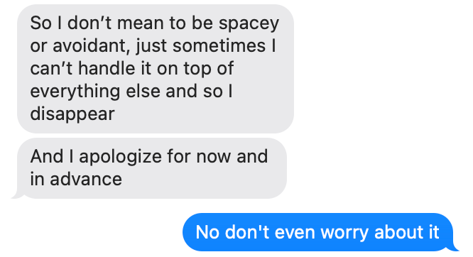 Again, it is important that moderation and nuance are emphasized because I am not saying that one needs to always drop everything for a friend. If I am especially busy or overwhelmed or unable to mentally fully be there for them because of a depressive episode, I’ll let them know. Being a good friend goes both ways—the willingness to listen but also the willingness to be patient and understanding if your friend cannot speak to you at the moment.