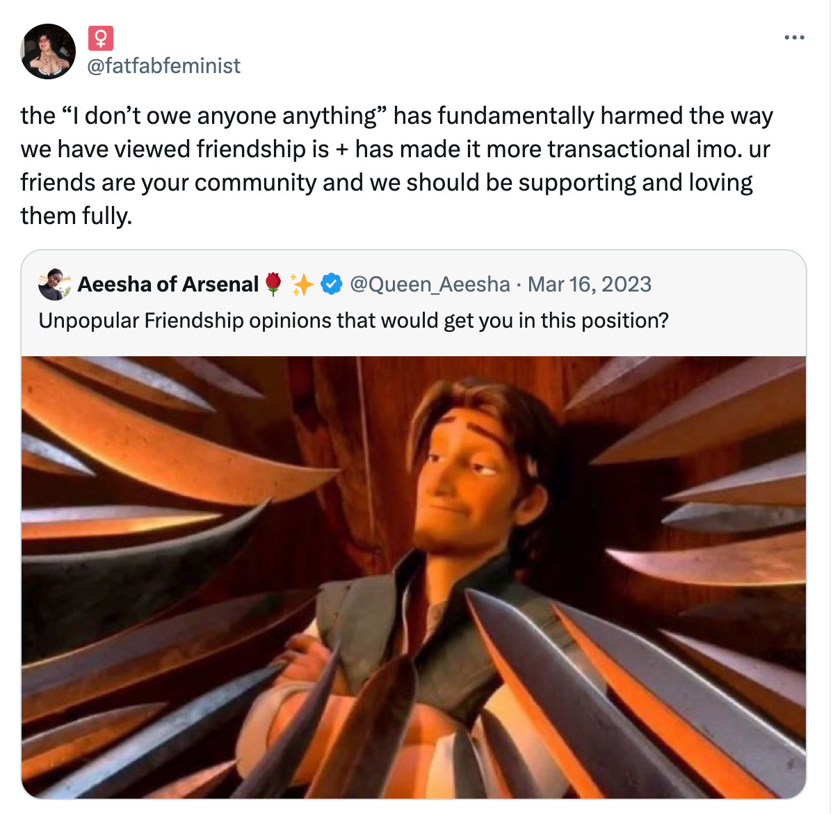 I try not to talk bad about social media, because I am on it all of the time and I have gotten quite a bit of useful information/new paradigms from various platforms. But I think the quickness and sense of impermanence leads to a bit of sloganeering. Couple this with therapy speak and we have a recipe for concepts like "quiet quitting friendships."